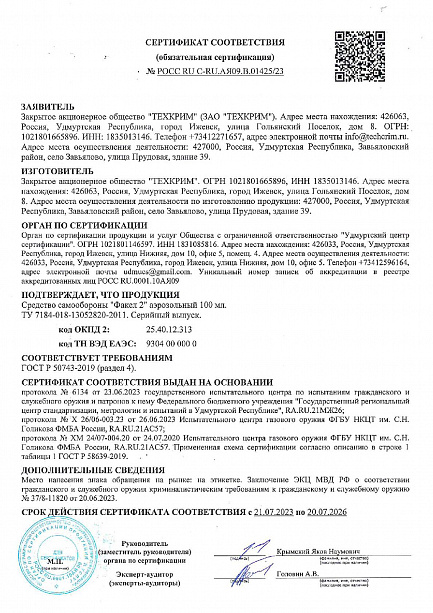 Газовый баллончик «Факел 2» допустим к использованию в качестве гражданской самообороны лицами старше 18 лет. Приобрести продукцию можно на территории РФ без разрешительной документации согласно ФЗ «Об оружии».