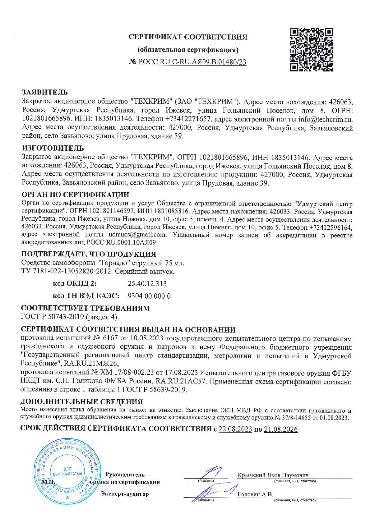 Средство самообороны «Торнадо» объемом 75 мл выпускаются со струйным и аэрозольно-струйным типом распыления. Отличительной особенностью «Торнадо» является наличие лазерного целеуказателя, что обеспечивает точное попадание аэрозольной струи в цель, а также интенсивный выброс содержимого.