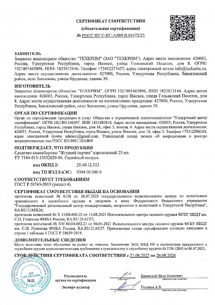 Газовый баллон «Жгучий перчик» выпускается объемом 25 мл или 65 мл. В состав входит ОС (олеорезин капсикум). Общий ресурс работы составляет 5 секунд или 10 кратковременных нажатий. Выброс жидкости в секунду – 7-10 грамм. Образуемое контактное пятно при распылении на дистанцию в 2 метра – 45 см. Продолжительность воздействия на нападающего составляет 20-30 минут. Можно применять при температуре от -10°C до +50°C. Срок годности – 36 месяцев.